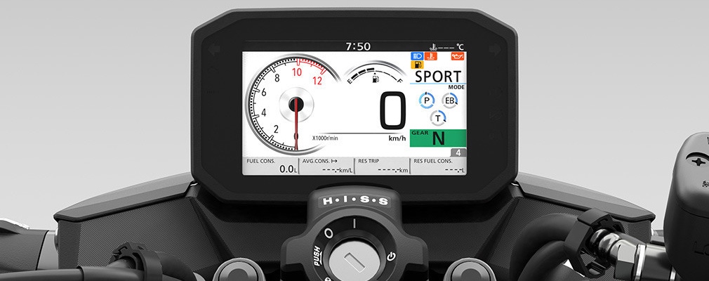 | TABLERO 100% DIGITAL | La pantalla TFT a todo color de 5 pulgadas brinda toda la información necesaria para los viajes arriba de la nueva CB750 Hornet. |